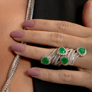 São brincos e anéis, em forma de coração, com as mais belas pedras em tonalidades esmeralda e turmalina fusion.